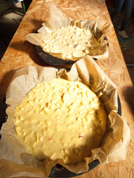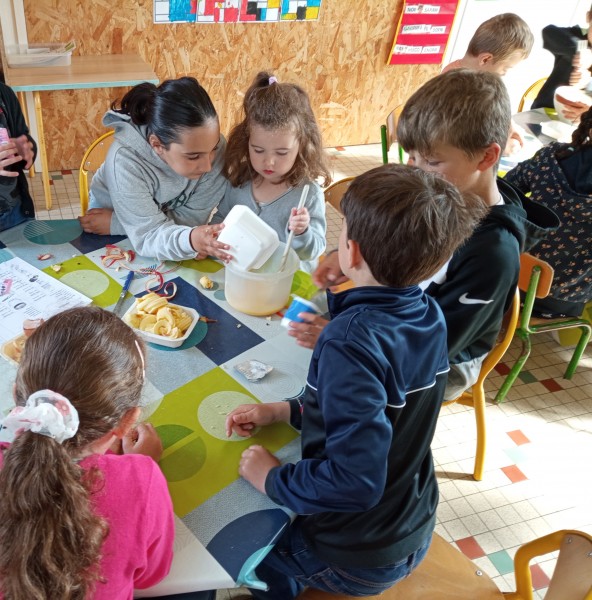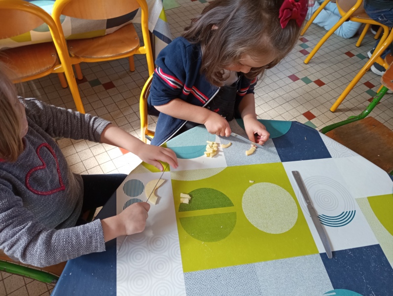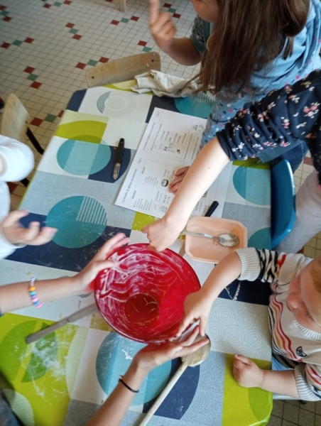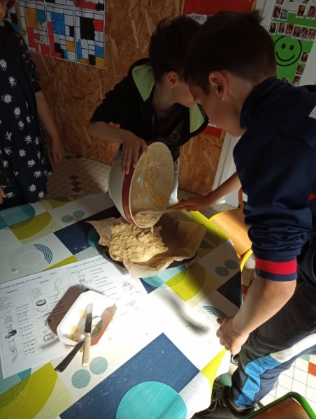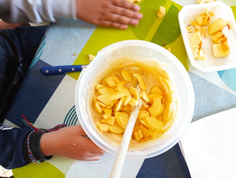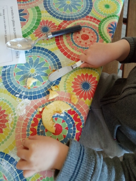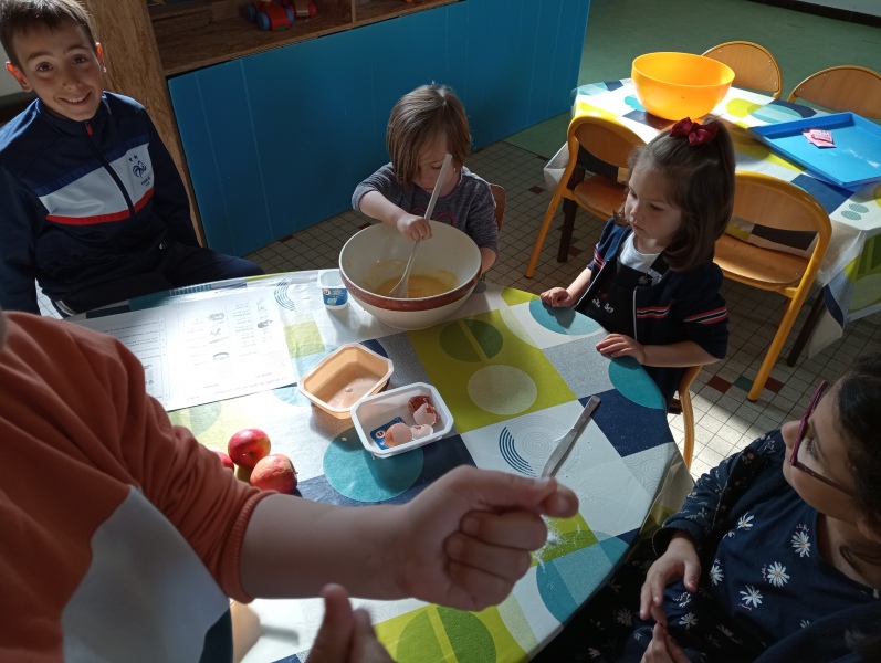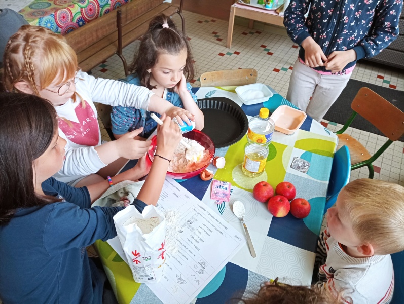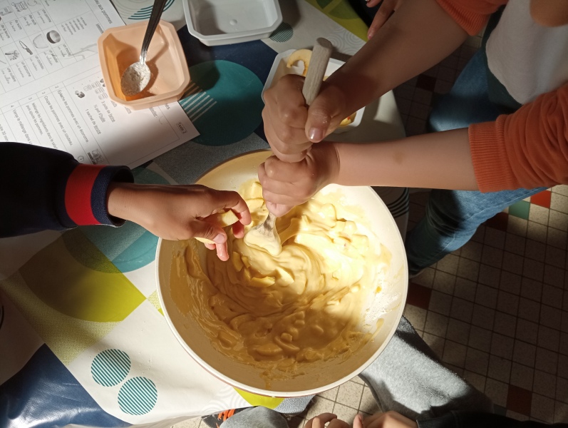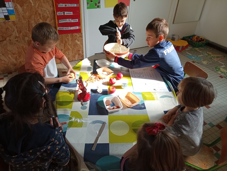 Puis jeudi c’était notre « journée cuisine » en ateliers multi-âges : des PS au CM1, les plus grands aidaient les plus petits à préparer un gâteau aux pommes que nous avons dégusté le lendemain. Chacun a mis la main à la pâte ! Une fois terminé, les grands nous ont raconté des histoires en attendant la récréation !