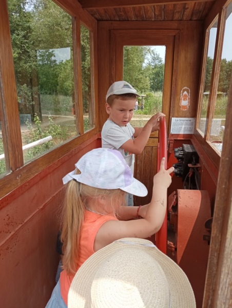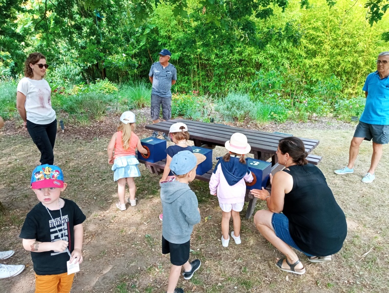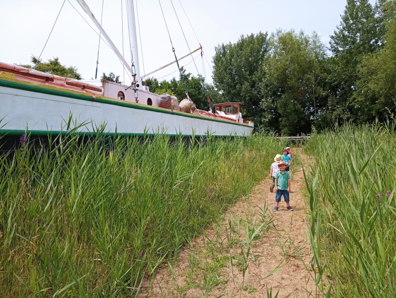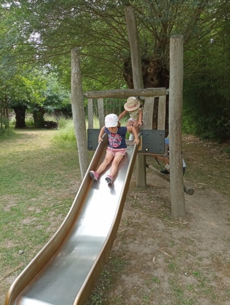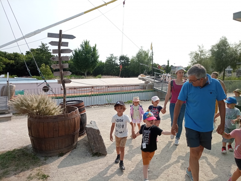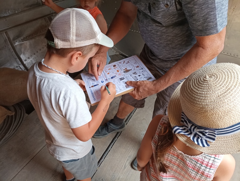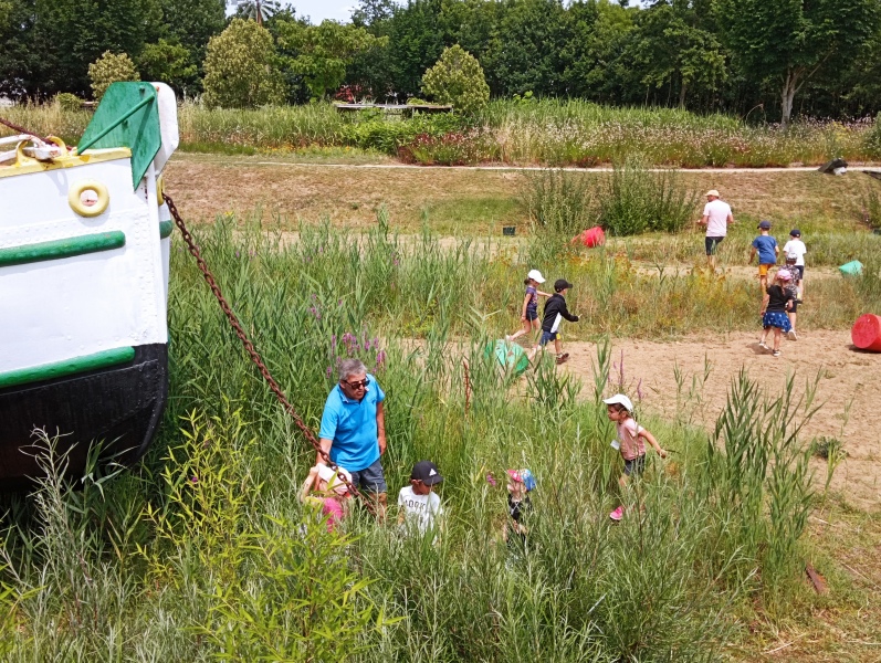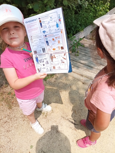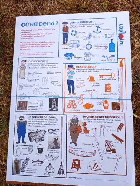 Après le pique-nique, nous avons retrouvé Aline qui nous a proposé une chasse au trésor : « Où est Denis de Marinier ? » Nous avions 5 personnages à retrouver dans tout le parc, avec leurs outils de travail (le marinier, la marinière, le charpentier de bateaux, la lavandière et le pêcheur). Nous avons donc arpenté le parc de long en large, exploré les cales du bateau… et sommes revenus sur nos pas … avant de repartir dans l’autre sens… !