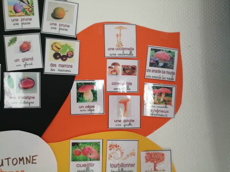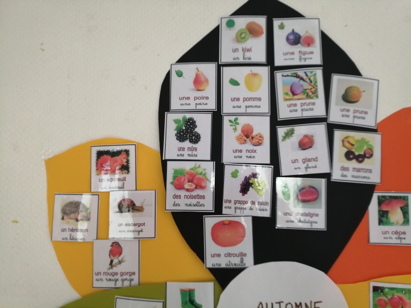 Nous avons commencé par nommer chaque élément et nous les avons ensuite classés en différentes catégories : les arbres, les animaux, les champignons, les fruits et les légumes, les objets, la météo et les verbes d’action.