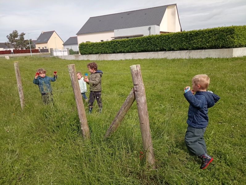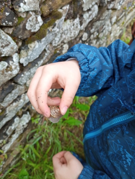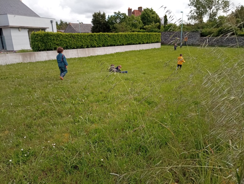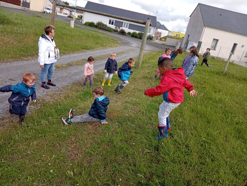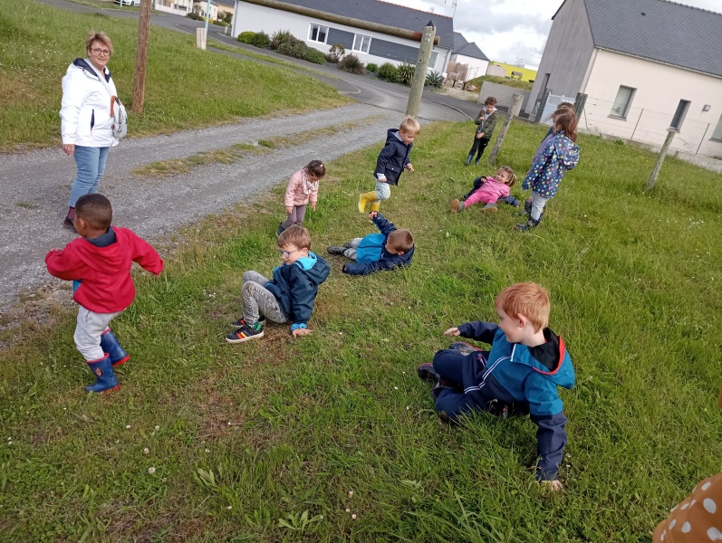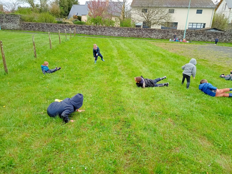 Puis après un léger goûter pour ceux qui ont faim, c’est jeux libres : courir, rouler sur la butte, rechercher des escargots, verres de terre géants ou insectes divers… Pas peur de nous mouiller ou de nous salir : nous sommes tous bien équipés…