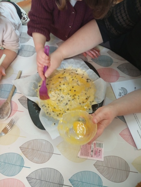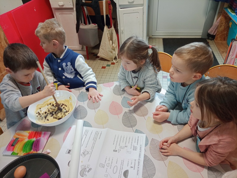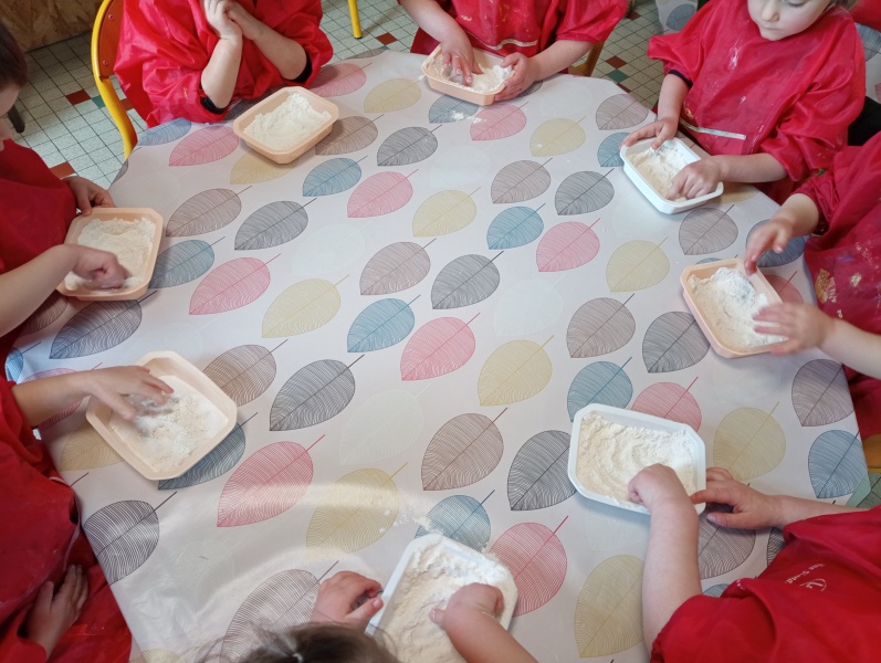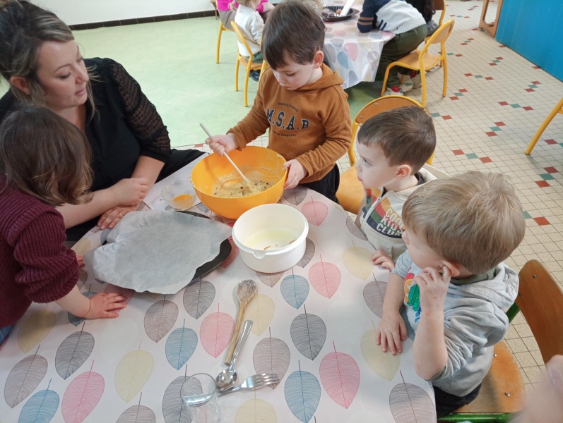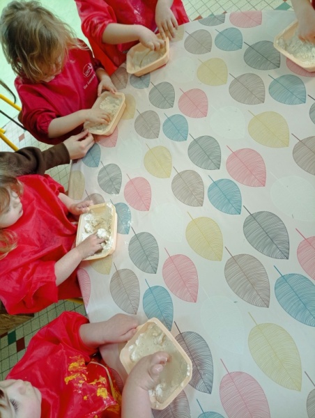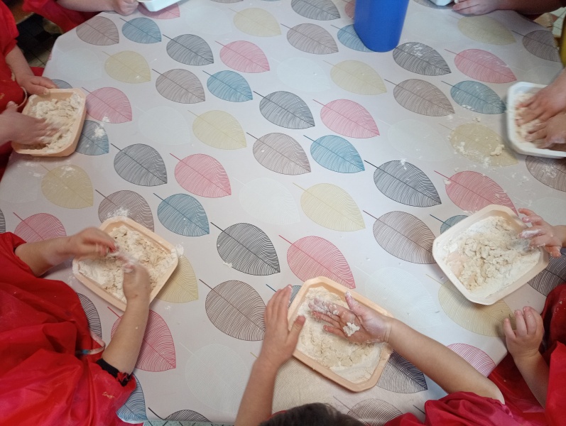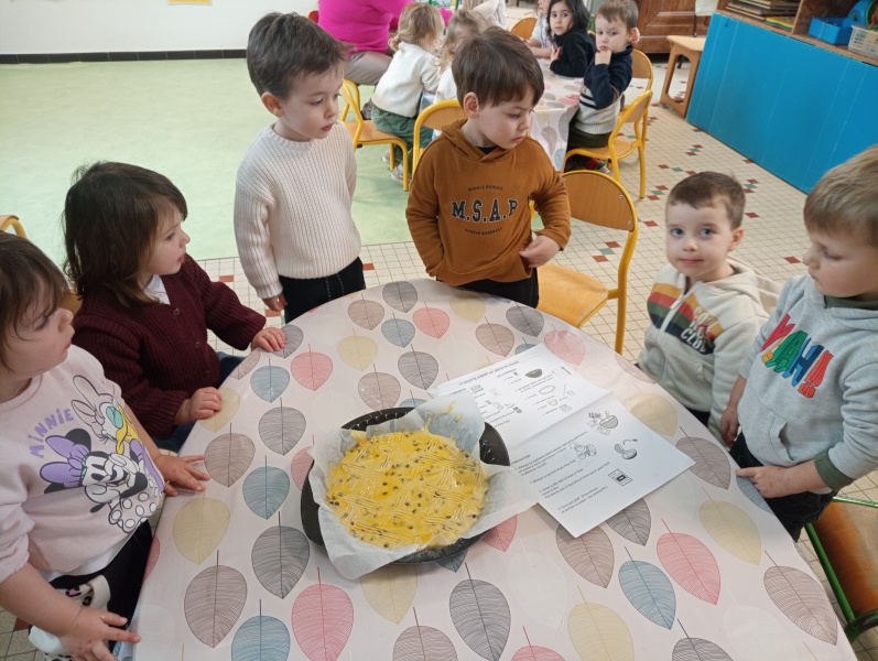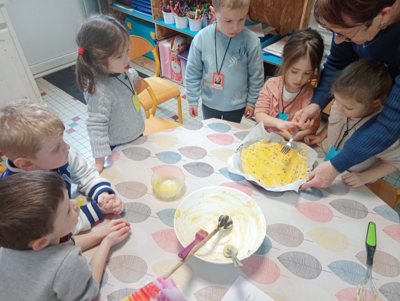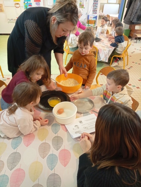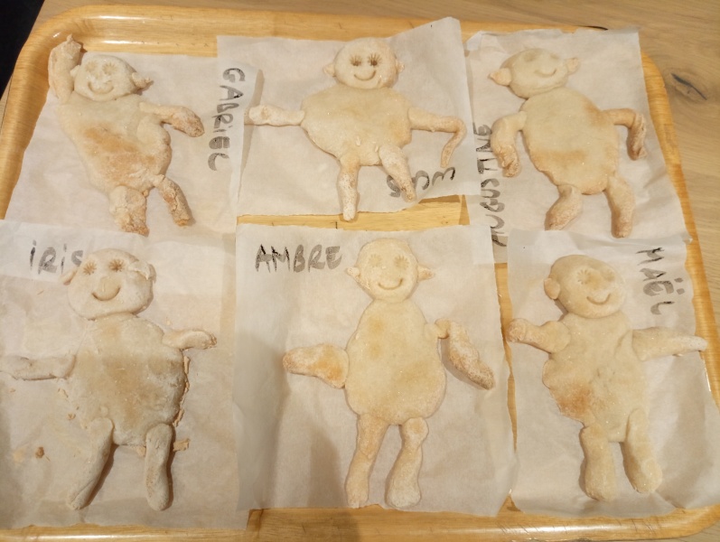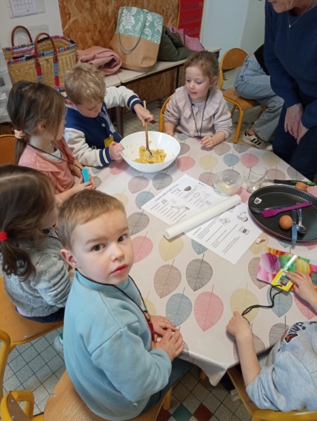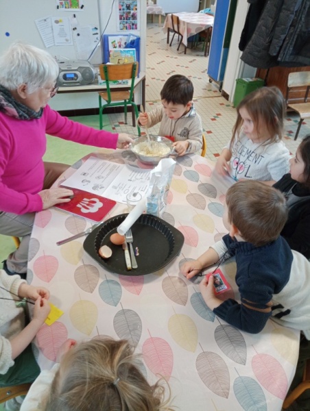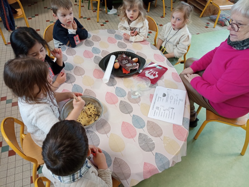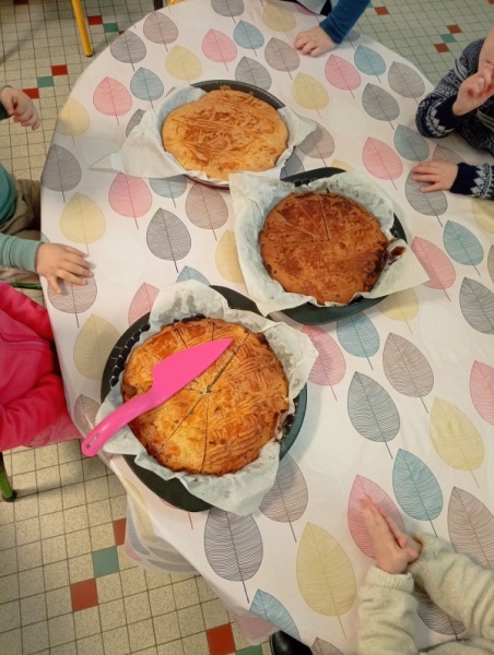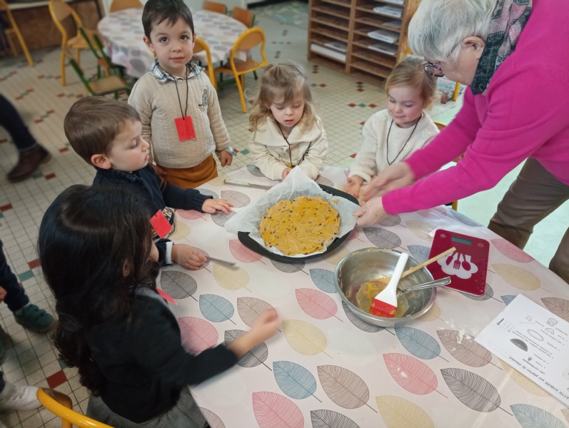 Le lundi 20, nous avons préparé la traditionnelle galette des rois de Janvier : appropriation de la recette, atelier cuisine avec la Mamie d’Assia et la Mamie d’Augustine (que nous remercions pour leur aide), puis dégustation avec la célébration de 2 reines : Céleste et Assia !
