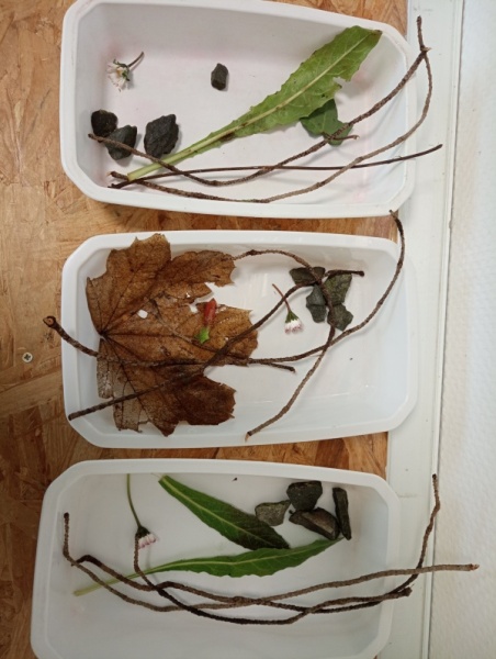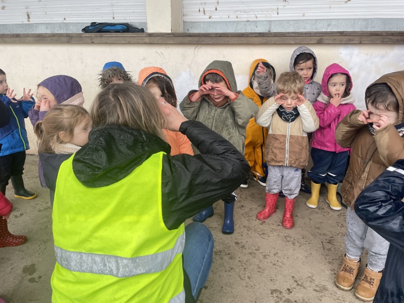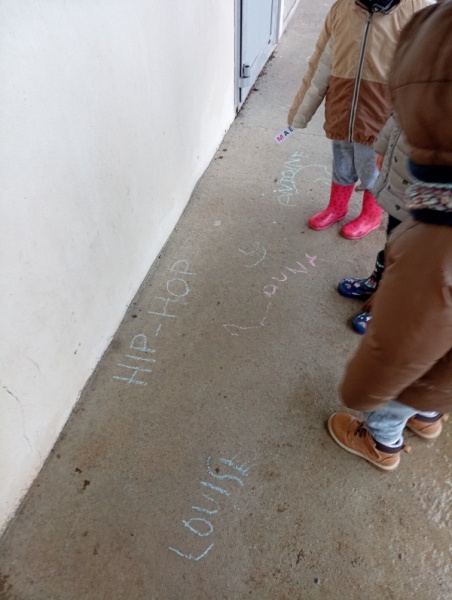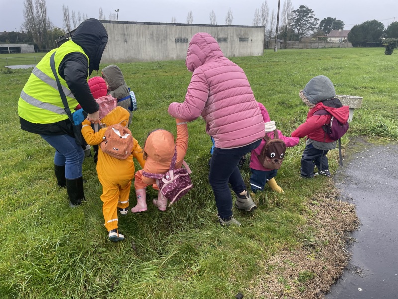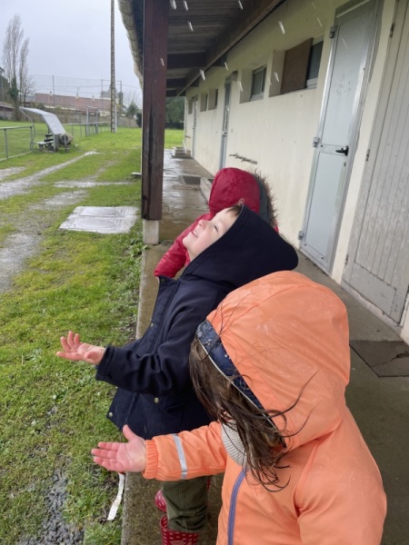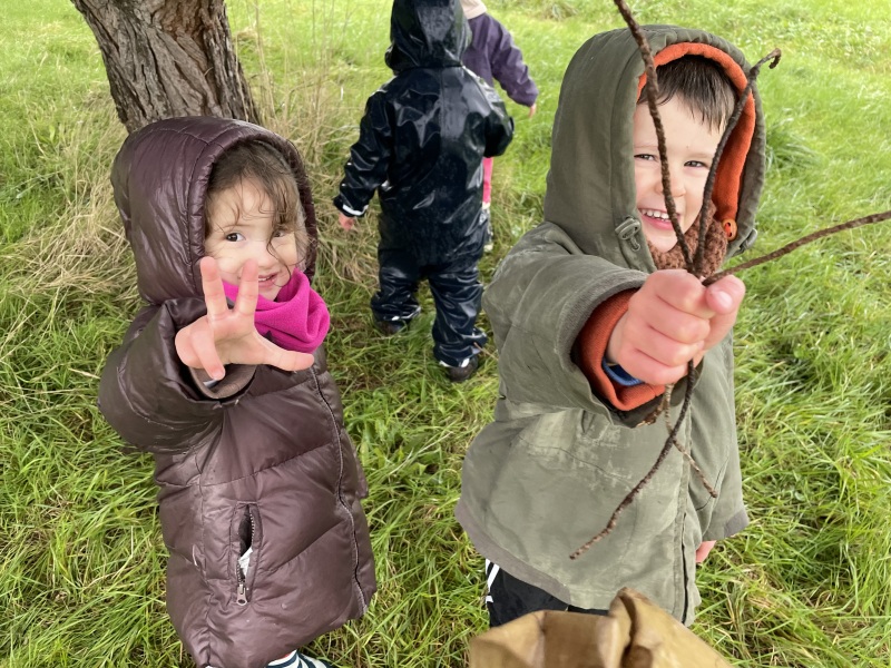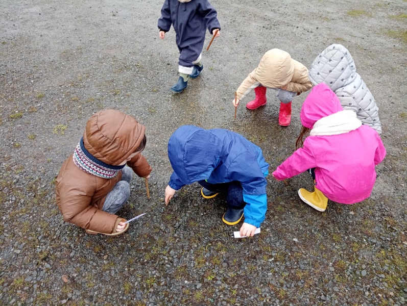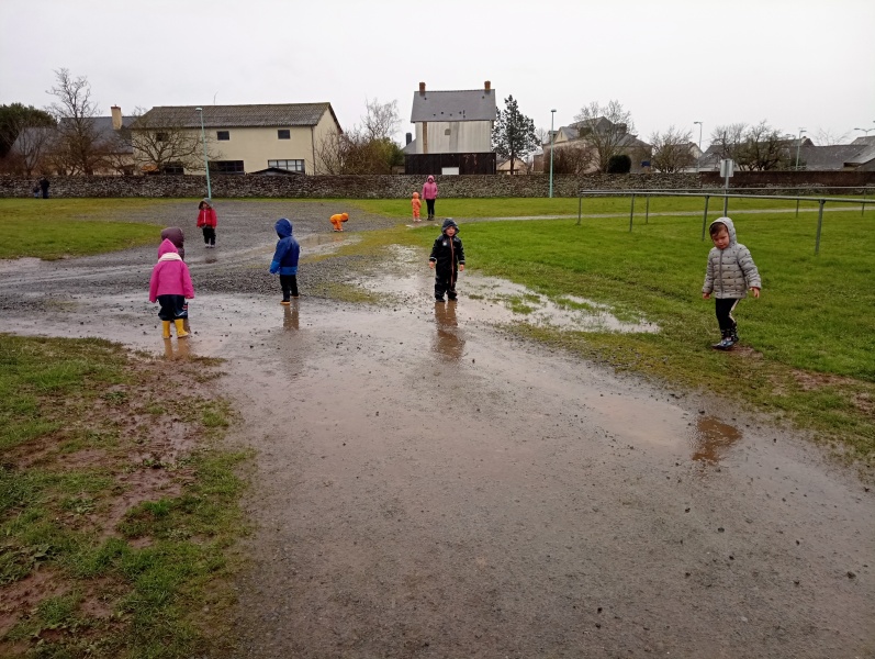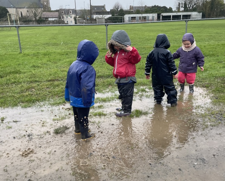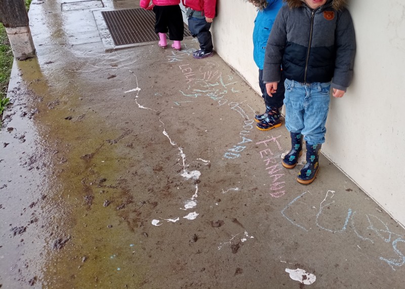 Le vendredi 24, nous avons bravé les intempéries pour rejoindre notre classe du dehors. Au programme : écriture de son initiale (puis du prénom avec l’adulte), chasse au trésor pour trouver 1 fleur, 2 feuilles, 3 brindilles et 4 cailloux, puis recherche de bâtons pour réaliser des jeux d’adresse. Sans oublier de faire chanter notre pinson, de chanter nous aussi notre chanson de l’école du dehors, de manger le goûter, et de jouer… principalement à sauter dans les énormes flaques d’eau ! Quel plaisir, malgré le vent et la pluie !! Un grand merci à la maman de Fernand et à la mamie d’Augustine qui sont rentrées toutes mouillées à la maison !