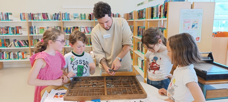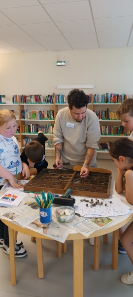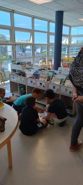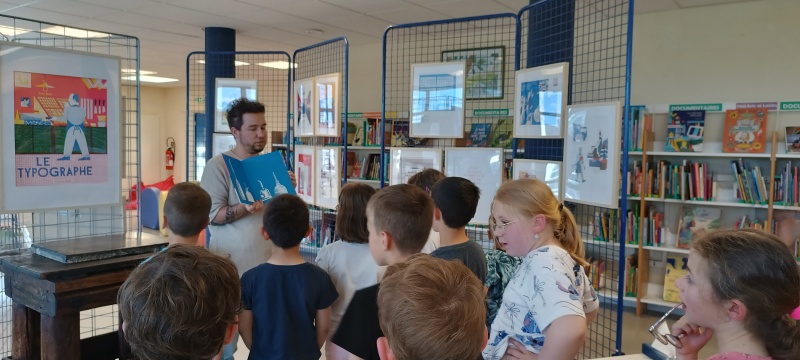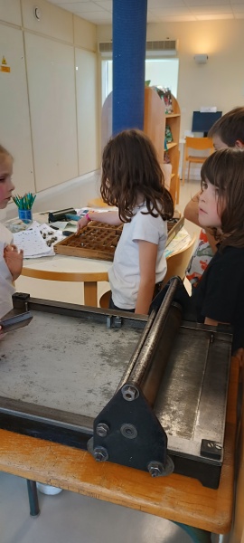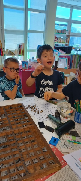 Le vendredi 29 avril, les élèves de CP-CE1 ont pris le car à destination de la Médiathèque d’Ancenis pour une visite thématique : « Le typographe ». Nous avons ainsi découvert ce livre « Le typographe » de G. Bazin. Il explique et retrace toute l’histoire de l’écriture : des premiers hiéroglyphes, en passant par les signes chinois et en s’attardant sur l’imprimerie et Gutenberg en particulier. A travers un jeu de « cherche et trouve », les élèves se sont familiarisés avec l’histoire de l’écriture. Ils ont également essayé l’écriture en « tampon » et découvert plusieurs machines d’autrefois : le pressoir qui permettait de mettre de l’encre sur tous les tampons avant d’imprimer sur la feuille…