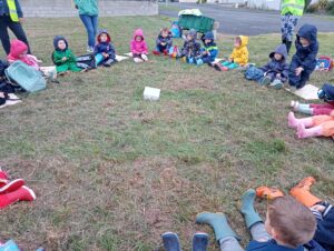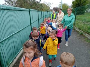 Le premier vendredi d’octobre, nous sommes arrivés en pantalon ou combinaison de pluie, vieux pantalon, bottes et manteau imperméable… pour aller découvrir notre « classe dehors », accompagnés de mamans et mamies, sans qui nous ne serions pas sortis ! MERCI.