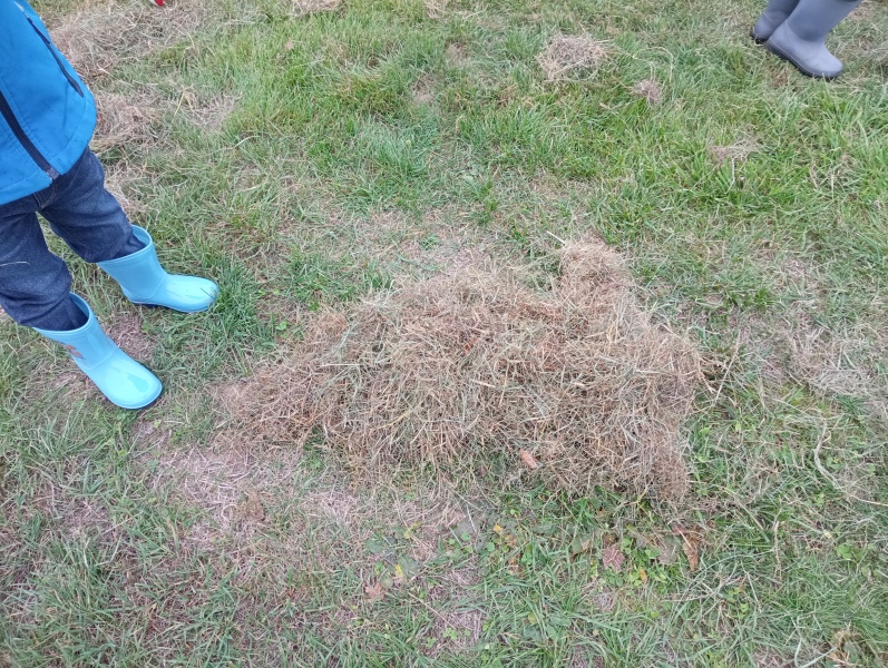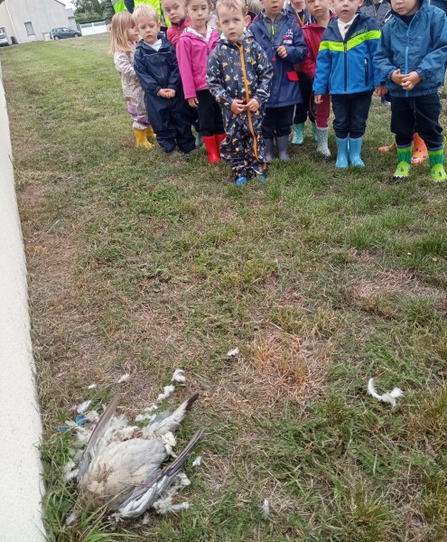 Sur place nous avons d’abord installé notre « espace regroupement », puis nous avons fait le tour de notre « classe dehors »: on longe le fossé, puis le mur de la maison de Maël, on remonte la butte jusqu’au petit parking (en restant toujours dans l’herbe), puis on longe un nouveau mur en redescendant (en évitant un pigeon mort, sans doute mangé par un gros chat, ou un loup ??!), on passe le petit fossé pour rejoindre les sapins, jusqu’aux barrières du terrain de foot, avant de revenir derrière les vestiaires (toujours en restant dans l’herbe), et enfin rejoindre notre espace de regroupement.