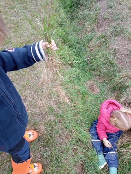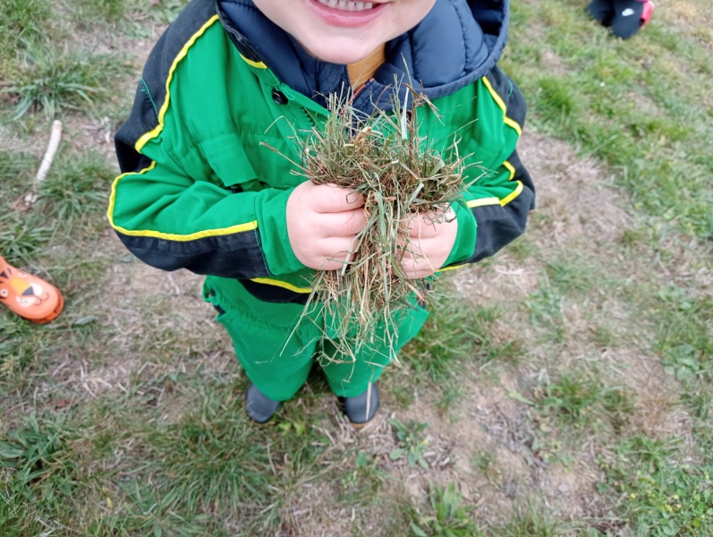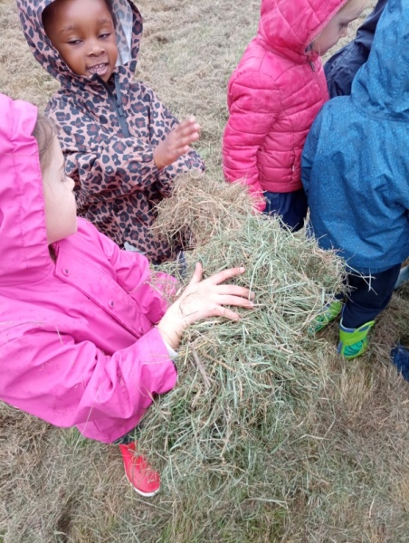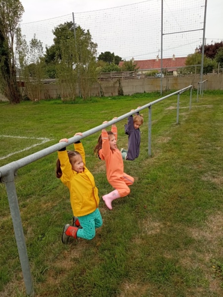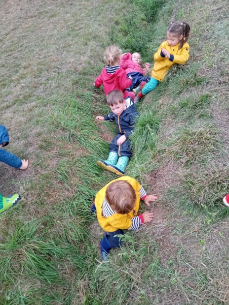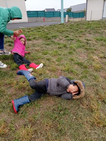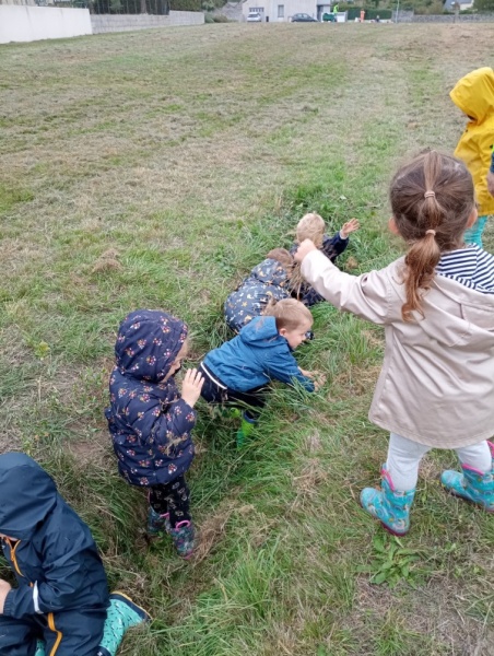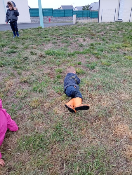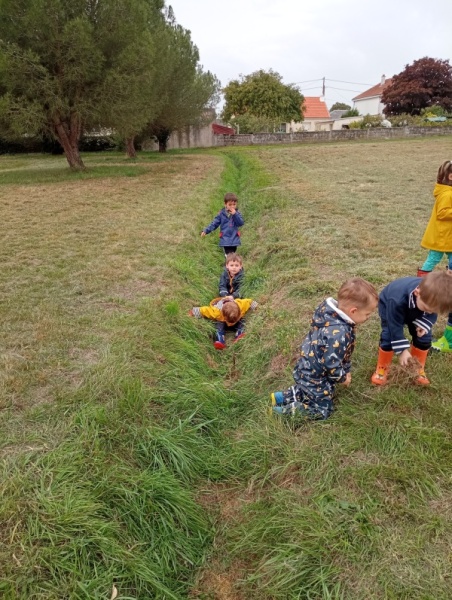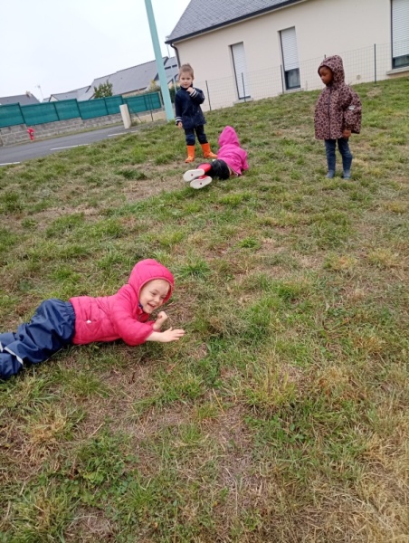 Après un petit goûter en extérieur, nous avons pu explorer librement ce nouvel espace de jeux : courir, rouler, ramasser l’herbe coupée pour faire des nids ou des cabanes, ou remplir le fossé, ou jeter sur les copains… Marcher dans le fossé, sauter par dessus ou bien s’y allonger… Se suspendre aux barrières, sauter du gros cube en béton… Et trouver une mante religieuse, que nous avons ramenée dans une grande boite, pour la montrer à la classe de Stéphanie !