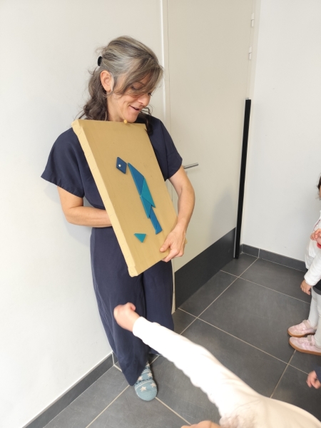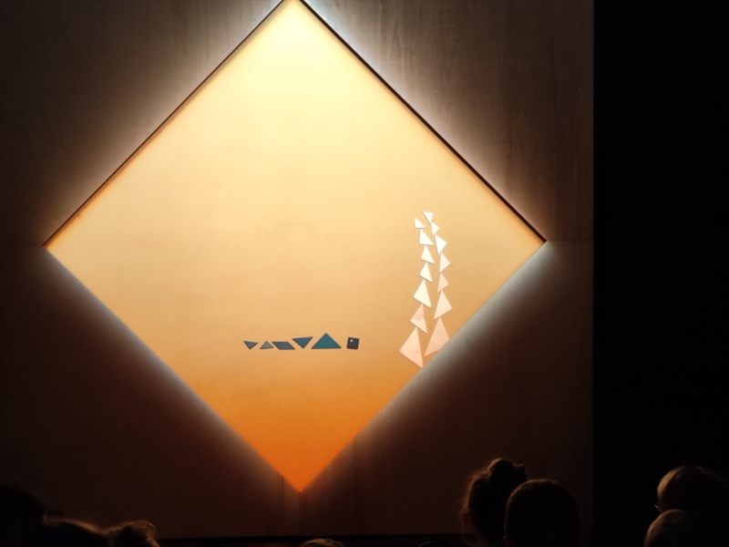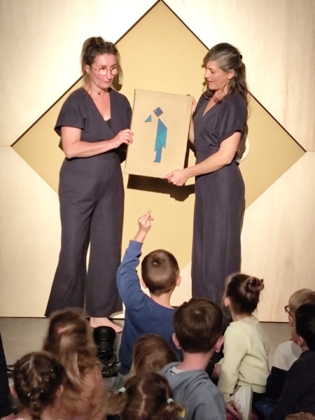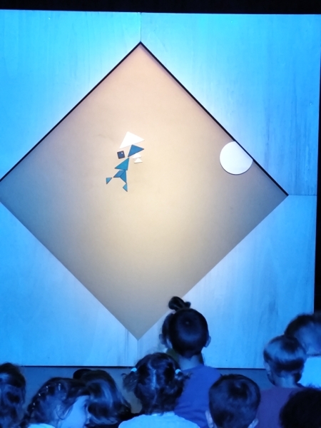 Les pièces de tangram donnent vie à des animaux (poissons, baleine, chameau), des objets (bateau, fusée, palmier). Ce spectacle se veut poétique et amène les enfants à développer leur imaginaire.