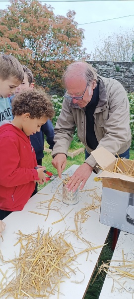 Ensuite, les élèves de CE1-CE2 ont accueilli les membres de l’association Vair-Environnement  : nous avons construit des hôtels à insectes que nous avons installés sur des branches près de nos potagers et à l’entrée de l’école. Nous avons utilisé du foin, des boites de conserves, des pots de fleurs et du grillage de poule… merci aux parents qui les ont donnés !! Nous avons aussi désherbé nos jardins et les CE1 ont préparé des semis : principalement des radis et des carottes !