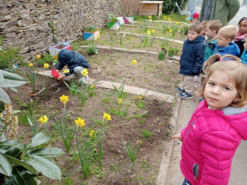 Nous avons aussi réalisé des plantations de plantes aromatiques directement dans notre jardin : persil, thym, ciboulette, et Nepeta (ou « herbe à chat ») qui fait pousser de petites fleurs bleues… A condition d’arroser régulièrement ! Alors nous avons instauré une nouvelle responsabilité quotidienne pour les enfants de la classe.